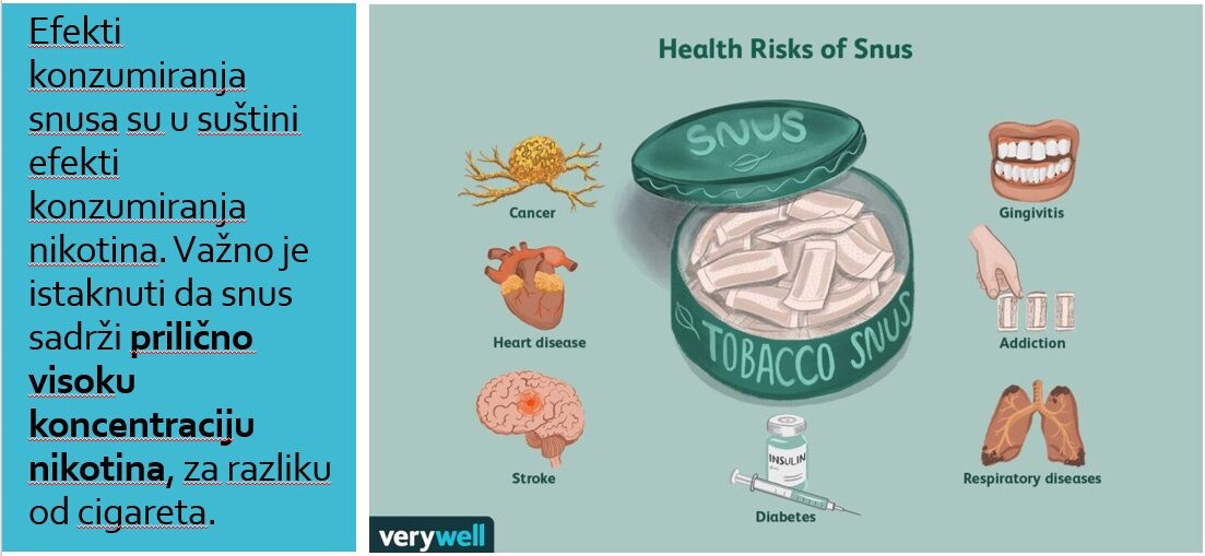 SNUS je vrsta duhana u prahu koja se stavlja ispod gornje ili donje usne, a nikotin se apsorbira direktno u krvotok. Iako se reklamira kao „bezdimna“ alternativa cigaretama, SNUS je jednako opasan i stvara jaku ovisnost.