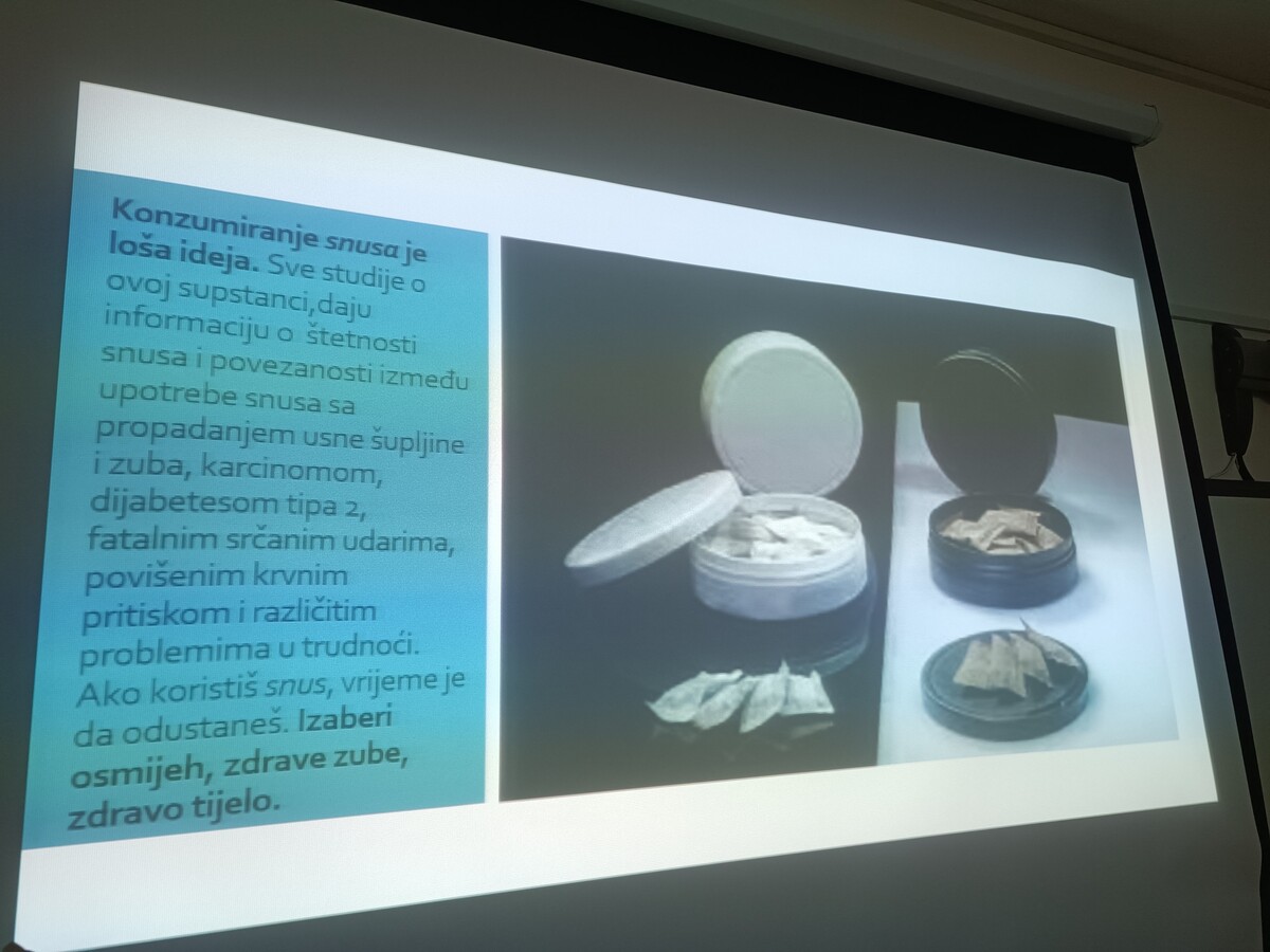 Učenicima je naglašeno da „bezdimno“ ne znači i bezopasno. Naprotiv, SNUS predstavlja ozbiljan rizik po zdravlje mladih i vodi u ovisnost koja se teško liječi.